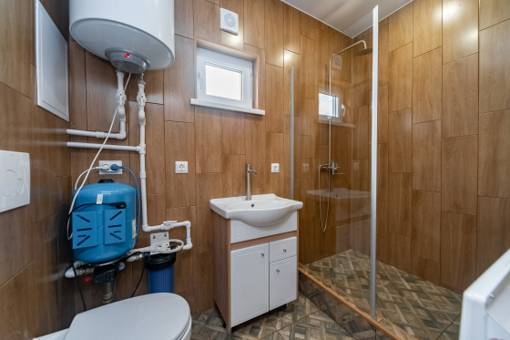 2 удобные спальни на втором этаже по 12 м². Отделка имитацией бруса с покраской. Натяжные потолки с большим количеством точек освещения. Лестница на второй этаж сделана на заказ. На полах ламинат 33ий класс. Влагостойкие двери с антивандальным покрытием. Входная дверь с терм разрывом 11.5 см. По периметру установлена иллюминация свесов и террас, освещает ночью весь участок. Канализация от гринсток' разведена и подключена. Собственная скважина 40 метров с питьевой водой Бесплатно и навсегда!